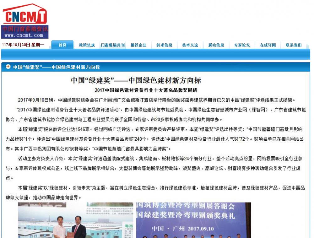 中華整木網(wǎng)發(fā)布有關2017中國綠色建材設備行業(yè)十大著名品牌獎的報道 (2017-10-30)