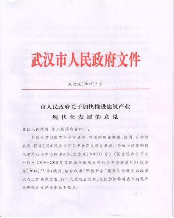 武漢市人民政府印發(fā)《市人民政府關于推進建筑產(chǎn)業(yè)現(xiàn)代化發(fā)展的實施意見》